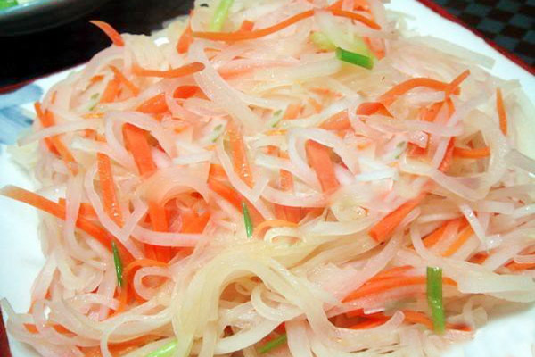 中医认为,萝卜味甘辛,有健胃、消食的作用,胡萝卜则含挥发油,具有芳香气味,能促进消化,用这种方法烹饪的萝卜丝清脆爽口、酸、甜、辣各味都有,适合早孕期间食欲不振的孕妇食用。