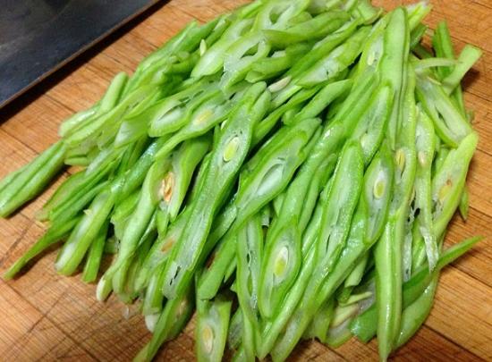 四季豆含有毒素,烹调时须熟透再食用,所以切成丝一要定多煮一会儿让它熟透。