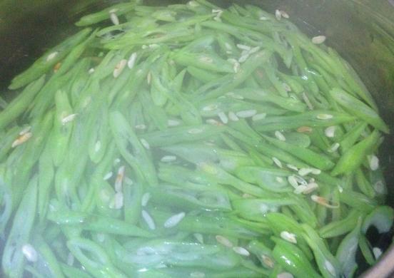 锅里烧开水,把切好的四季豆和胡萝卜丢进去煮一下。