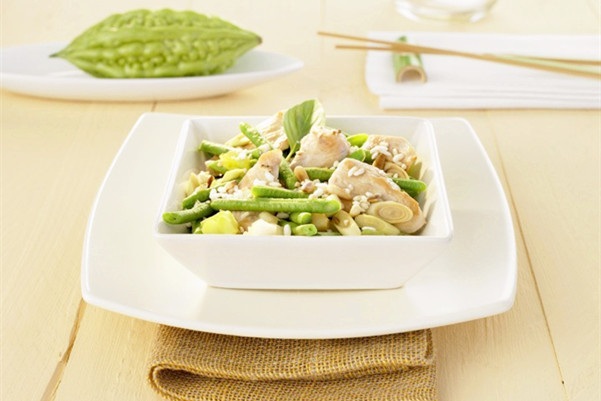 材料:鸡胸肉、苦瓜、盐、黑胡椒粉、生抽、水淀粉、香油各适量。